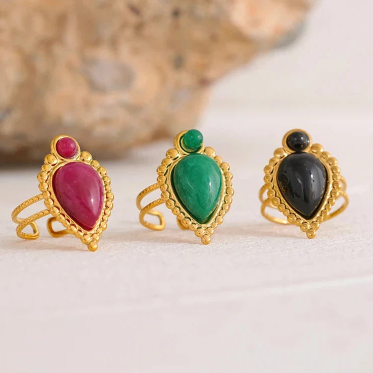 Anel Lua é uma joia marcante que combina pedras naturais em tons intensos de vermelho, preto e verde, trazendo elegância e mistério a qualquer look. Seu design geométrico moderno e a sofisticação do banho em ouro 18K tornam essa peça perfeita para eventos especiais. O anel possui montagem em tensão e é redimensionável, garantindo conforto e estilo.