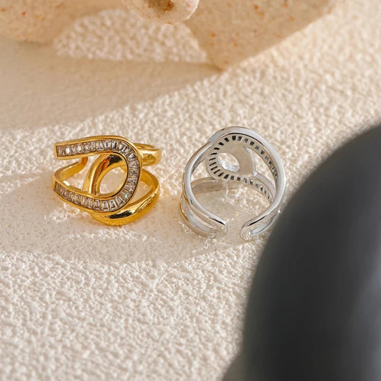 Anel Pétala Dourada é uma joia delicada e atemporal, perfeita para realçar a elegância em ocasiões especiais. Com design geométrico refinado, é feito em aço inoxidável banhado a ouro 18K e adornado com zircônias cúbicas que proporcionam um brilho sofisticado e discreto.