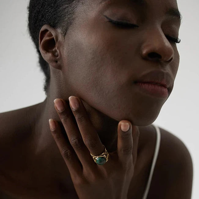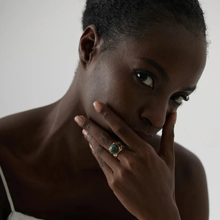 Inspirado no símbolo do raio, o Anel Keravnos une poder e sofisticação. Com uma vibrante pedra de turquesa africana, emoldurada por aço inoxidável banhado a ouro 18K, é a escolha perfeita para mulheres que desejam uma peça ousada e cheia de personalidade em ocasiões especiais.