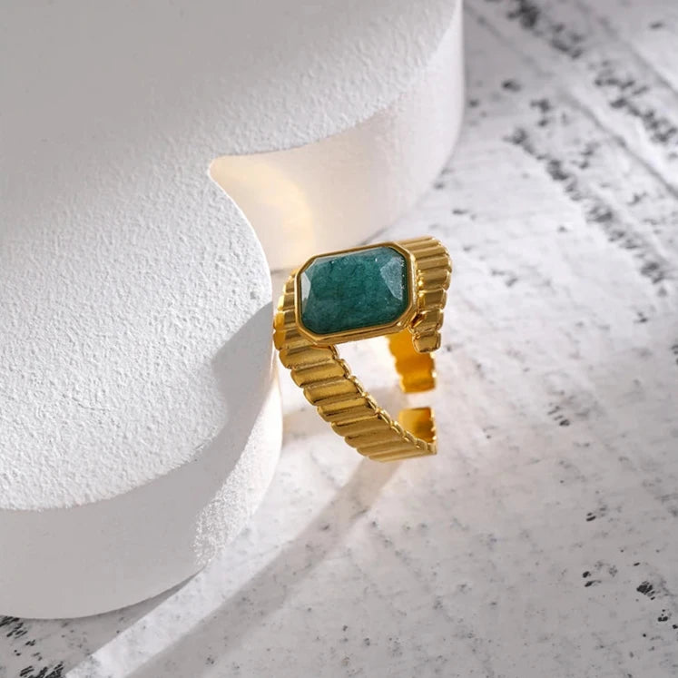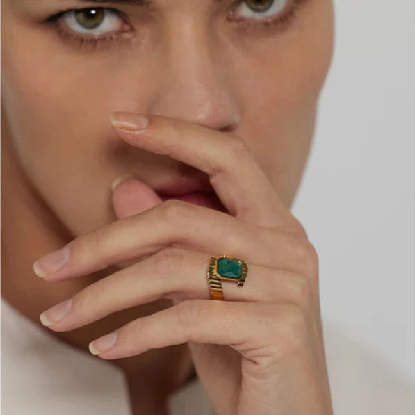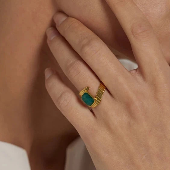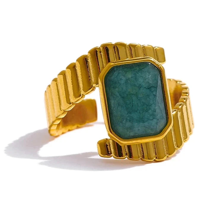 Anel Roma Pureza destaca-se pelo requinte da Apatita Azul, que traz profundidade e cor vibrante a um design geométrico moderno. Feito em aço inoxidável com banho em ouro 18K, é a peça ideal para mulheres que desejam expressar personalidade e elegância em festas e eventos especiais.