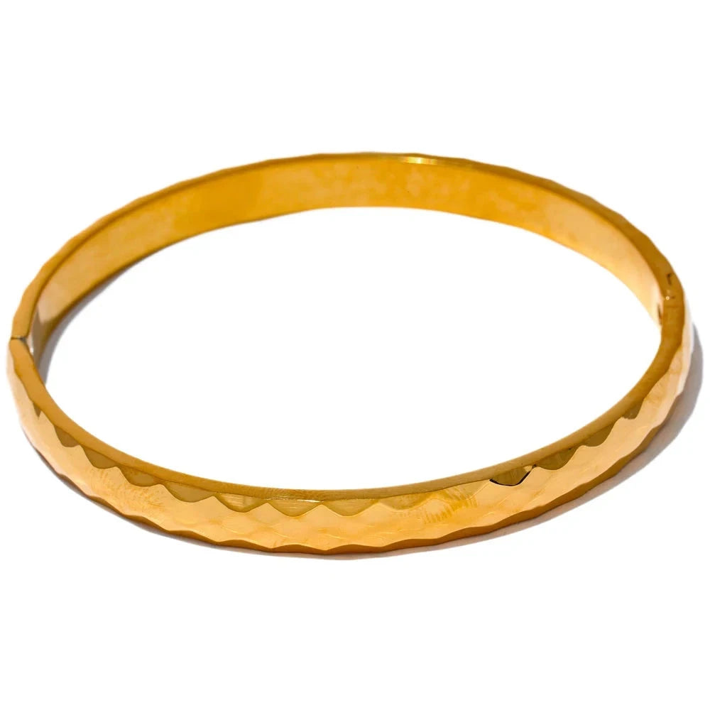 O Bracelete Prisma é um ícone de design, concebido para a mulher que aprecia a fusão da modernidade com a elegância que transcende o tempo. Meticulosamente forjado em aço inoxidável de excelência e revestido com um luxuoso banho de ouro 18K PVD, esta joia exibe um acabamento geométrico e uma estética minimalista, adaptando-se com perfeição a cada ocasião e estilo. Seu formato bangle oferece praticidade sublime e versatilidade incomparável, infundindo um toque de sofisticação que eleva desde composições casuais a visuais de alta-costura.