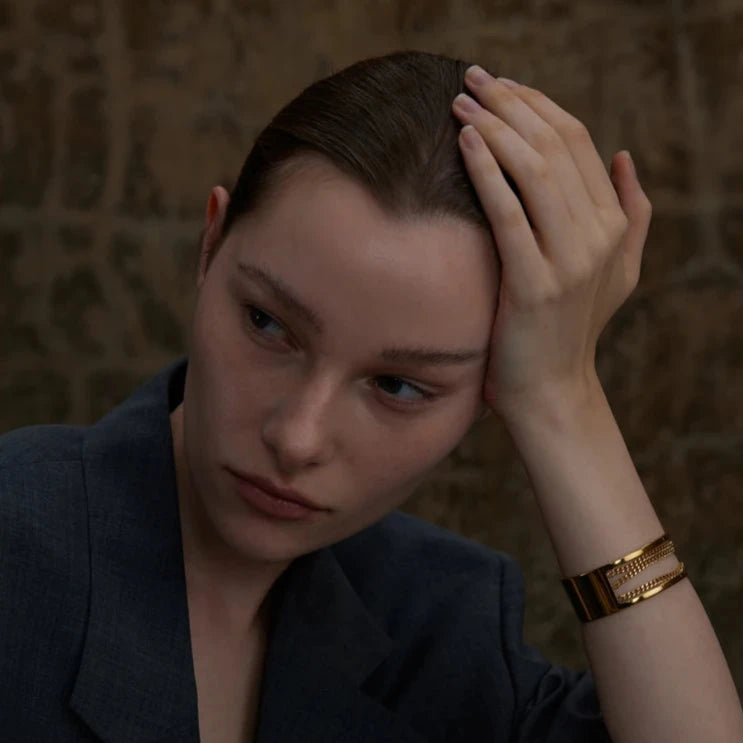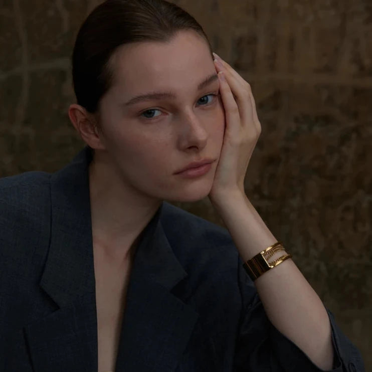 O Bracelete Linha Áurea é a escolha sublime para a mulher que busca uma joia marcante e sofisticada. Com seu acabamento em ouro 18K PVD e design geométrico, ele complementa qualquer look com uma elegância inquestionável e um estilo que transcende as estações.