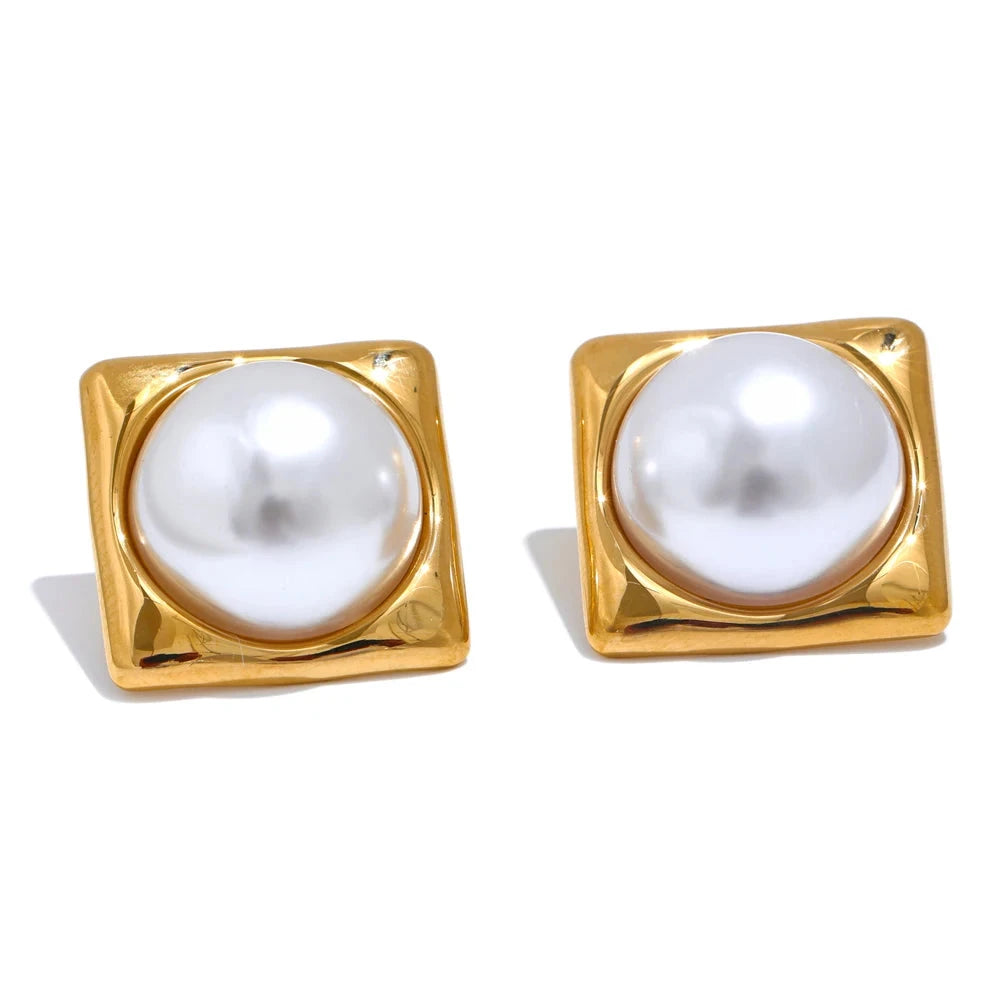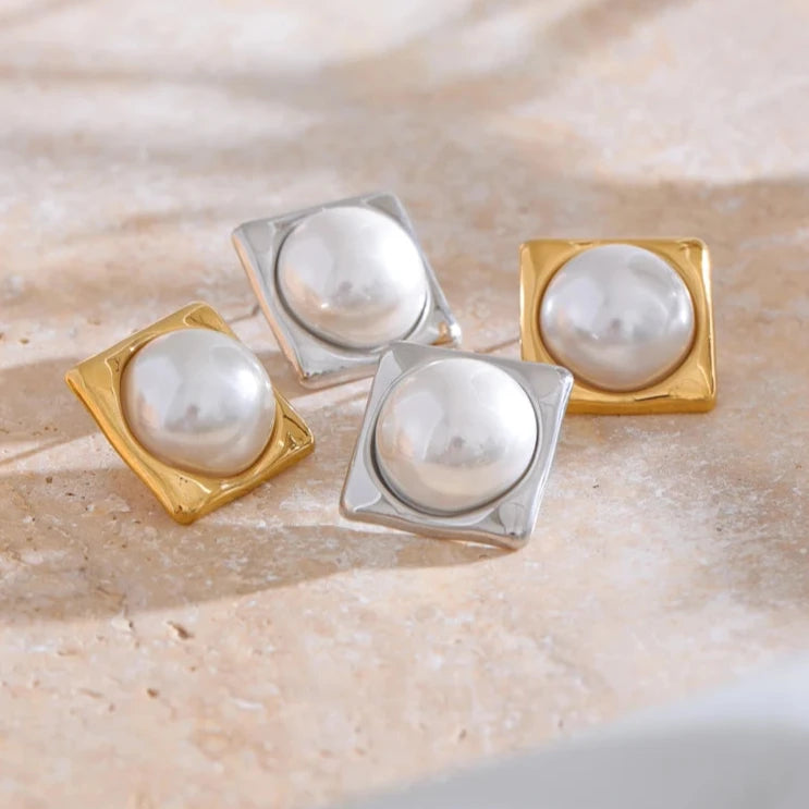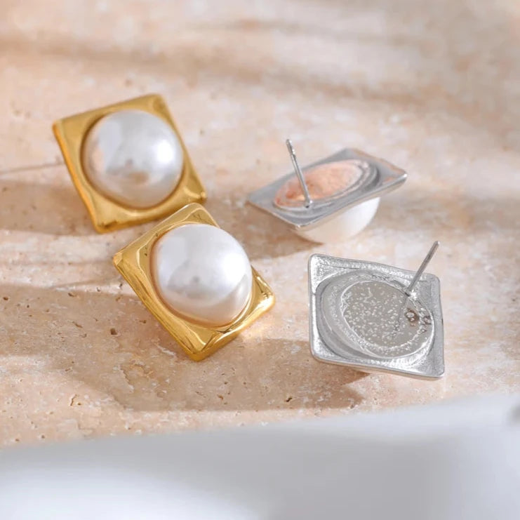 O brinco tem um formato quadrado moderno, com uma pérola no centro, criando um contraste entre o design geométrico e o toque clássico da pérola.
