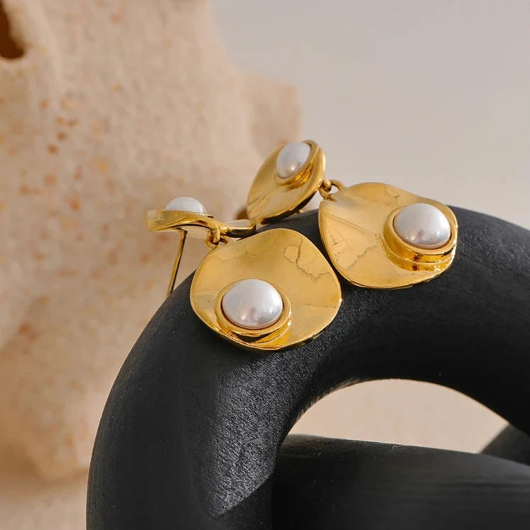- Material: Pérola simulada e aço inoxidável com banho PVD em ouro 18K.