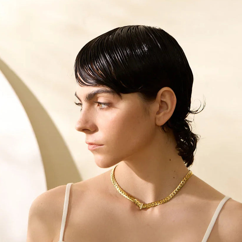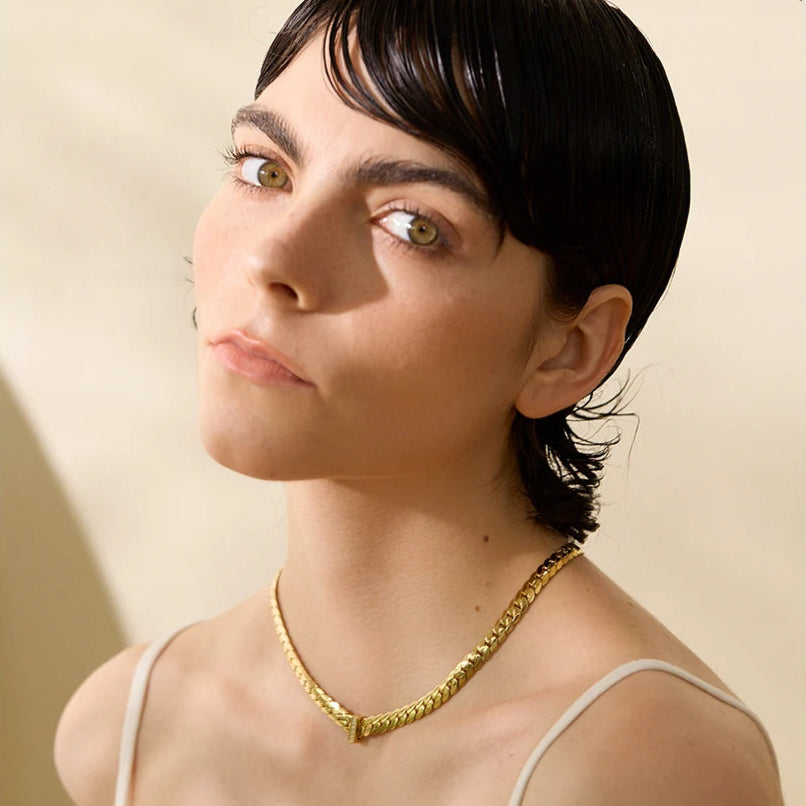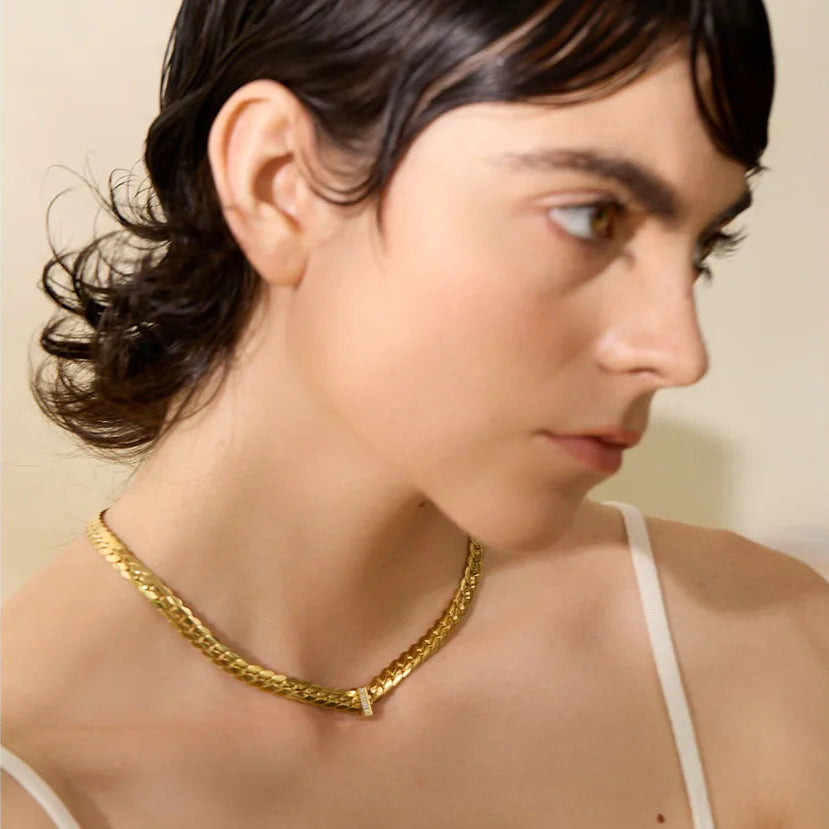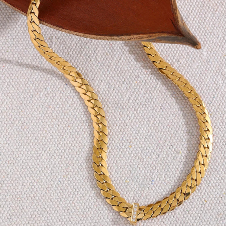 Esta é uma peça de excelência que celebra a distinção e a força sutil. O Colar Radiance é um acessório de primoroso design de corrente robusta, onde o brilho discreto da zircônia confere uma sofisticação imponente. Confeccionado em aço inoxidável e banhado a ouro PVD, ele oferece requinte e um toque de alto padrão para a mulher que exala confiança e um gosto apurado.