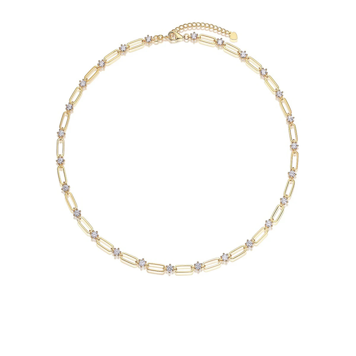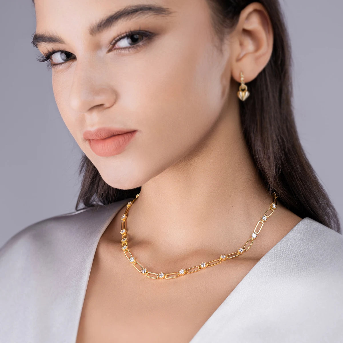 O Colar Elo de Luz é uma peça que redefine a elegância contemporânea, desenhada para adornar o colo com um brilho que transcende o convencional. Sua estrutura, inspirada na forma de um paperclip, combina a modernidade com a atemporalidade da joalheria fina. Cada moissanite, com seu brilho D-Color VVS1, irradia uma luz inigualável, criando uma sinfonia luminosa que celebra a sofisticação discreta. Esta joia é a escolha perfeita para quem busca expressar um estilo refinado e original, um toque de luxo que ilumina o visual e transforma qualquer ocasião em um momento de destaque.