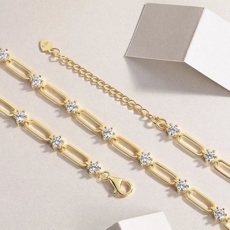 - Design: Corrente com elos interligados, complementada pelo brilho da moissanite.