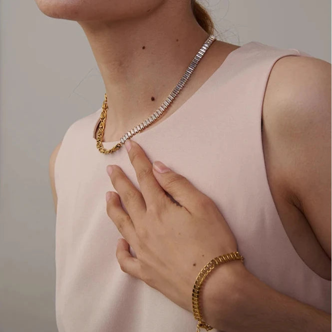 Pulseira Conto de Rubi é símbolo de elegância e sofisticação. Parte de um conjunto refinado que inclui colar e pulseira, destaca-se pelo brilho intenso das pedras de zircônia cúbica cuidadosamente cravadas. Com design geométrico moderno, é confeccionada em aço inoxidável com banho de ouro 18K, oferecendo beleza duradoura. Ideal para eventos e festas, adapta-se a diferentes combinações e valoriza o visual em qualquer ocasião especial.