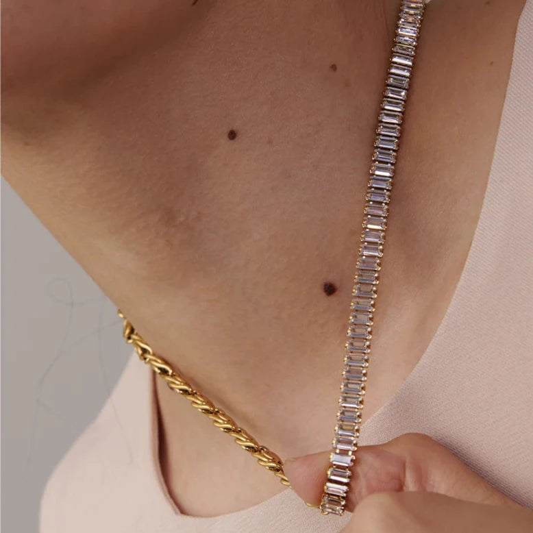 O Colar Conto de Rubi é uma verdadeira declaração de estilo e sofisticação, perfeito para ocasiões especiais ou para realçar o glamour no dia a dia. Composto por um conjunto de colar e pulseira, esta joia é adornada com pedras de zircônia cúbica, que oferecem um brilho encantador e se destacam em qualquer evento. Feito em aço inoxidável com um acabamento luxuoso em ouro 18K, é uma escolha atemporal para mulheres que apreciam peças elegantes e de alta qualidade.
